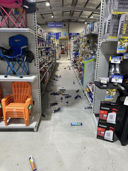 Muswellbrook, NSW – The recent 5.0 magnitude earthquake that rattled the Hunter Valley has left a visible mark on Muswellbrook, where one business Mitre Ten have shared striking images of the damage. The tremor, which struck near Denman at 12:01 PM on August 23, 2024, has caused significant disturbances in the area, with photos emerging showing shelves and stock thrown to the ground.