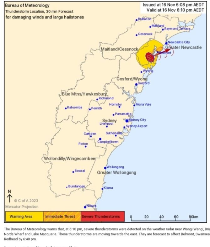 Next warning due by 6:40 pm. A general severe thunderstorm warning is also in effect for parts of the Hunter district. Stay updated through official channels: www.bom.gov.au or call 1300 659 210. Your safety is a priority.