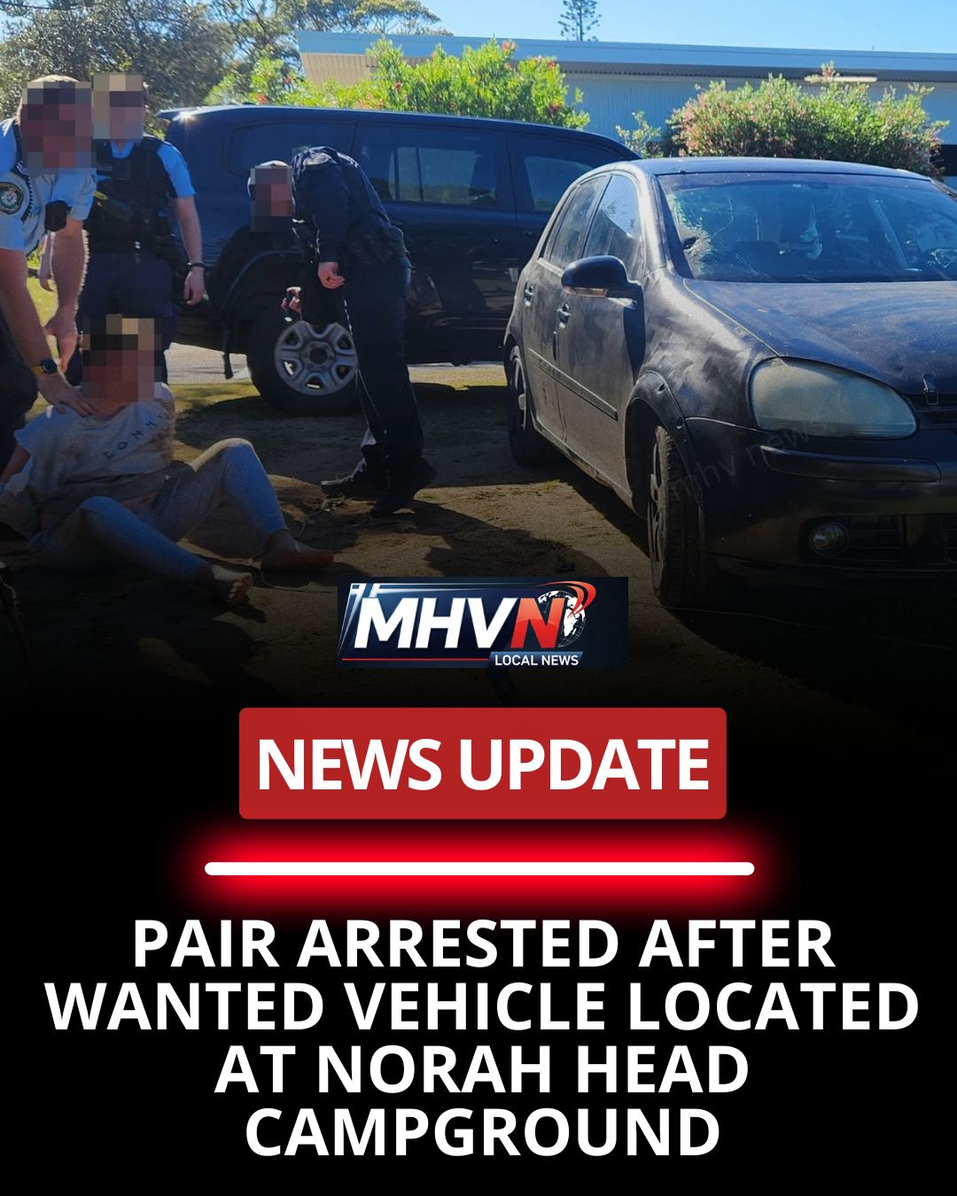 Police have arrested two people after locating a wanted vehicle displaying altered registration plates at a campground in Norah Head yesterday morning.