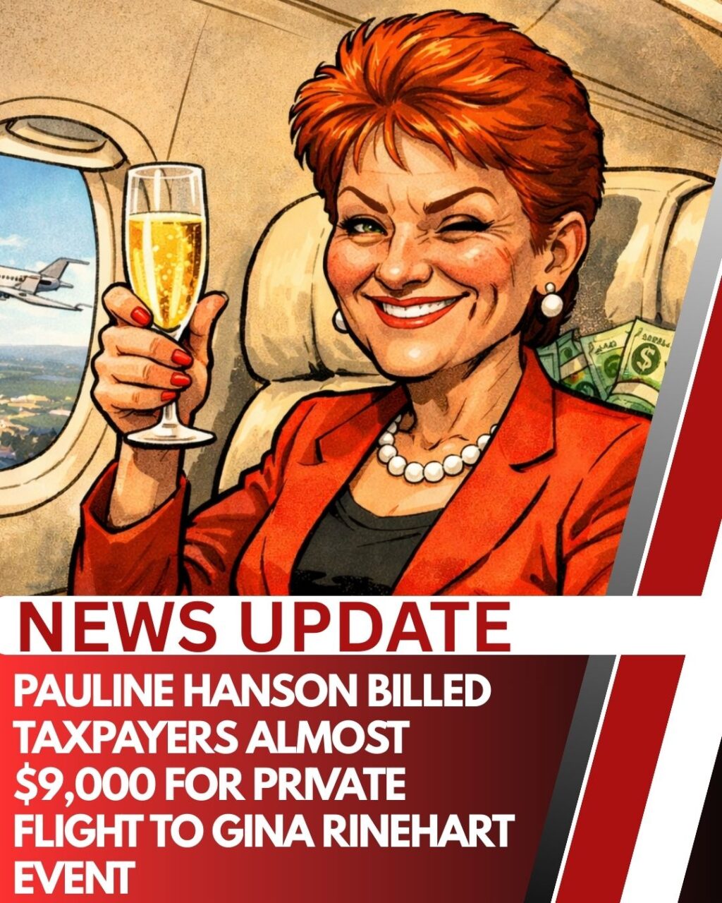 Controversy is soaring as One Nation leader Pauline Hanson racked up nearly $9,000 in taxpayer-funded travel for a private charter to attend an event linked to mining tycoon Gina Rinehart.
